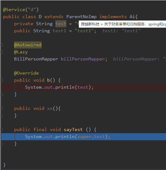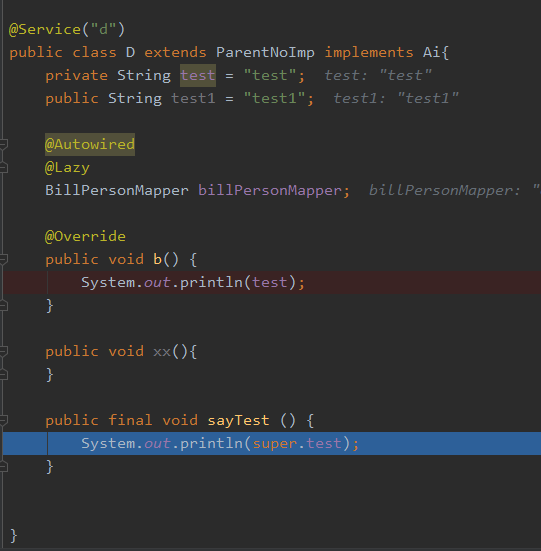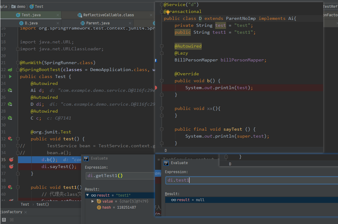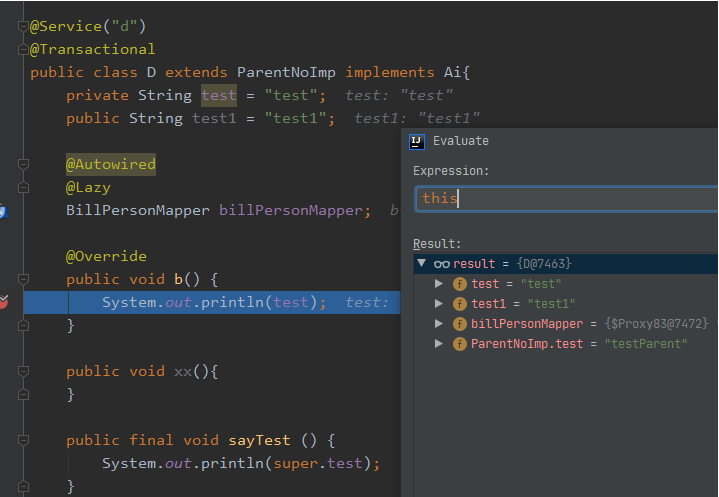 由以上两张图片作为对比,能够发现,图一再调用b方法时,使用了代理,走到了target的实体,可以获取到对应的实体属性。但是在图二,能够发现,调用sayTest方法,并没有使用代理方法,而是一种简单的方法调用,而代理类自身包含的属性都时对应的null。这里稍不注意,就会导致NPE。