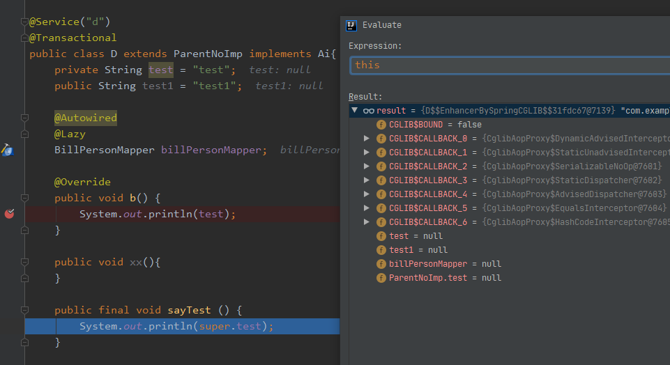 这里我思考了一下,如果把 @Transactional 注解注释掉,让这个属于一个正常的bean,而不是cglib,那属性还会时null值吗?