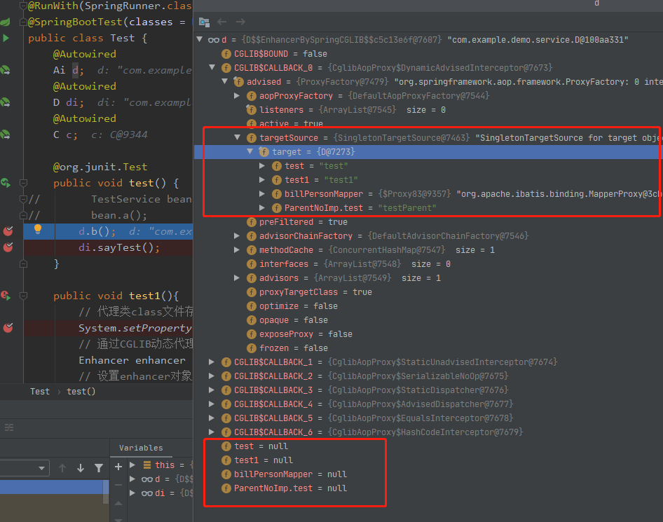 代理类(cglib),为什么自身的对应属性是null?而不是初始化时的默认赋值?这也是这次研究的重点!!!这里仔细说说我研究的过程。