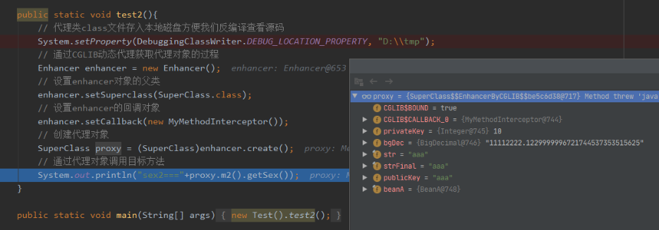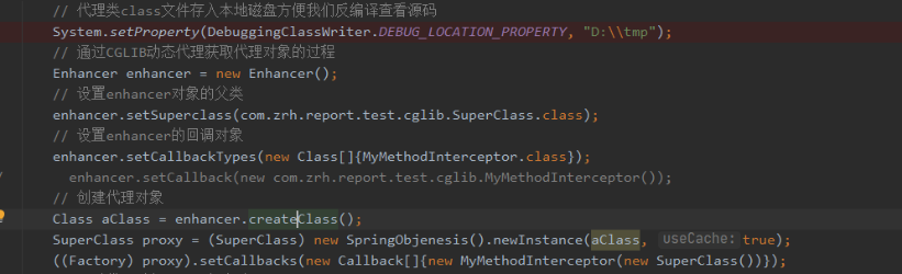 这里就很纳闷,为什么这样写最外层的属性就有对应的值,而spring动态代理出来的却没有。所有翻阅了spring的源码,发现spring源码使用cglib来生成代理类的class,而不是直接生成代理对象