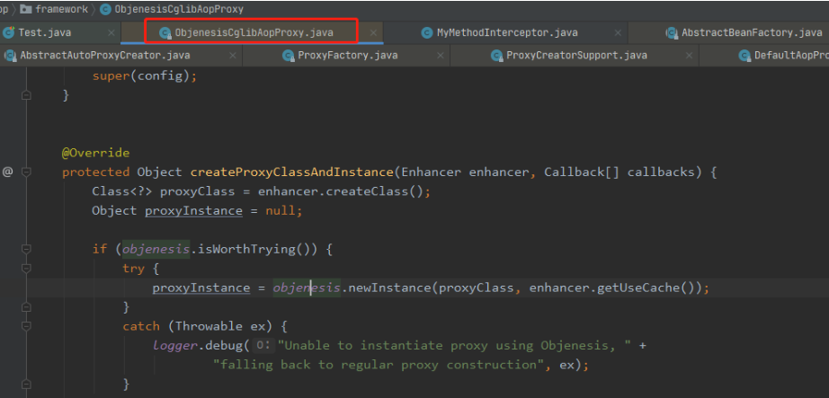 spring生成cglib不是通过对应的实例来生成代理类,而是使用了createClass()来生成class,最后通过SpringObjecesis工具来生成对用的代理对象。但是为什么spring用工具初始化时,最外层属性是null呢?这里我把目光放在了SpringObjecesis工具如果初始化上了,看了SpringObjecesis源码发现