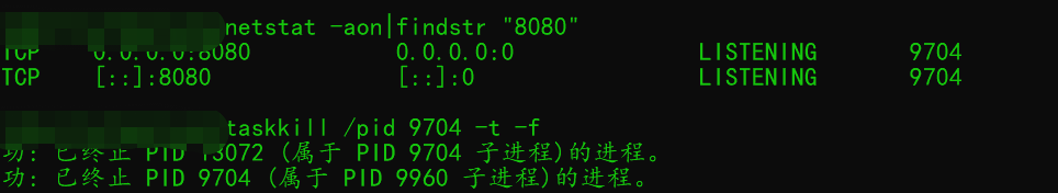 netstat -aon|findstr "8080"查看端口监听信息