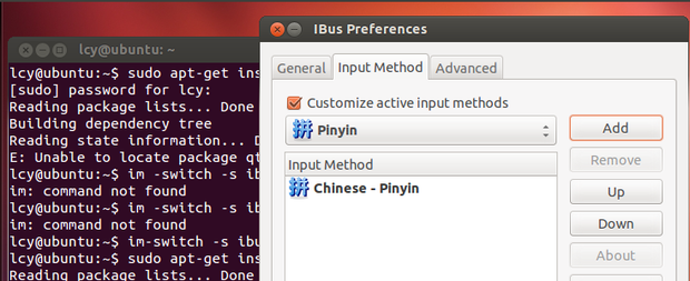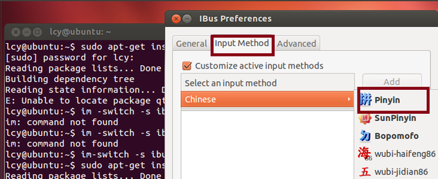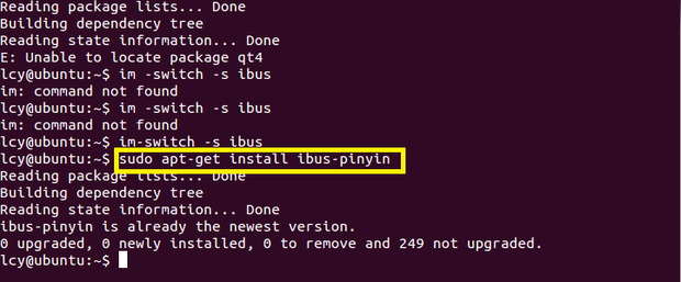 输完命令后就启动了安装拼音引擎,继续在终端输入命令:sudo apt-get install ibus-pinyin