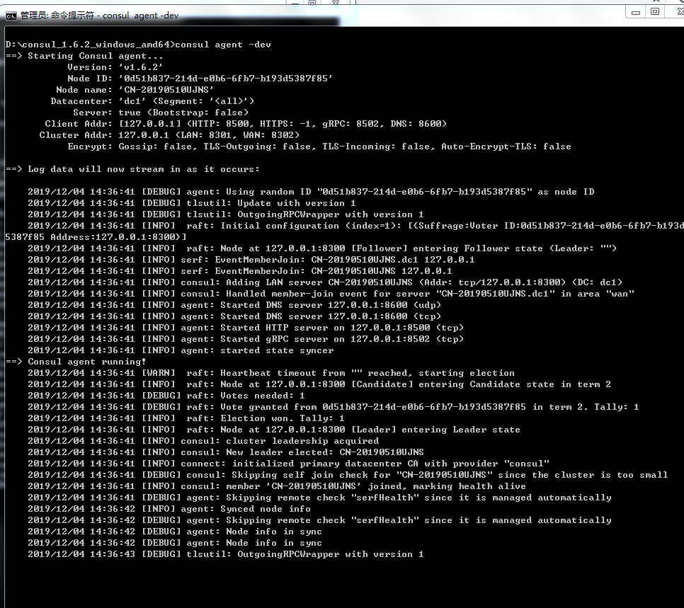 cd 到目录consul.exe所在目录,执行启动命令: consul agent -dev //启动服务, -dev 表示开发模式运行,另外还有 -server 表示服务模式运行。