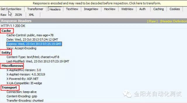 同样使用Fiddler 查看Response header, 点击Inspectors tab ->Response tab-> headers 如下图所示