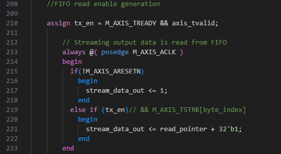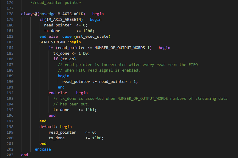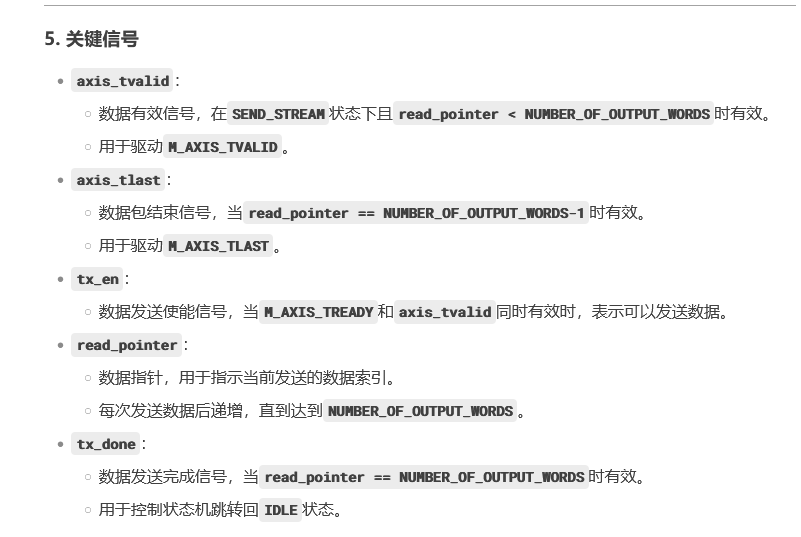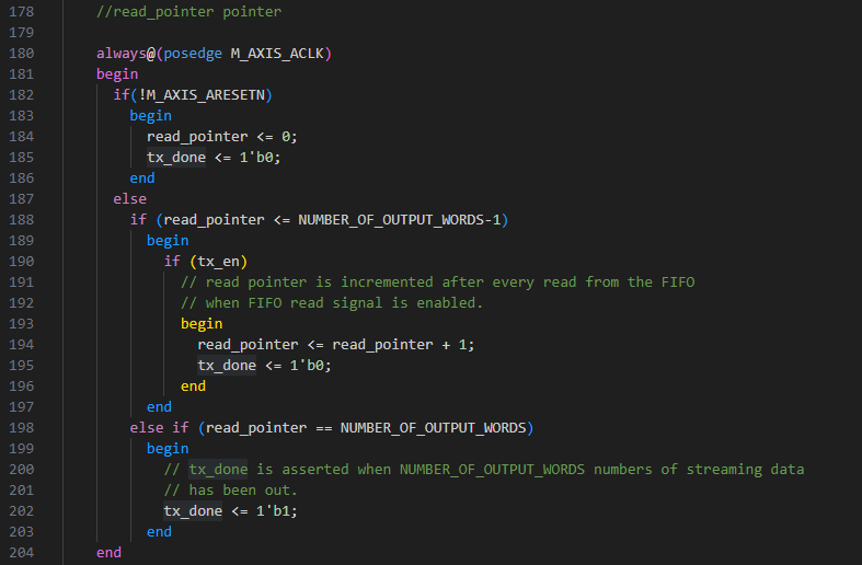 根据上面的状态机,看一下其中关键信号的代码,下面是tx_done的代码,简单来讲,当“read_pointer == NUMBER_OF_OUTPUT_WORDS”条件达成后,tx_done保持1不变,又read_pointer只会在“tx_en为1”时加1,而tx_en为1的其中一个条件就是状态在SEND_STREAM状态,故tx_en信号无需我们关注。但这里面因为tx_done变回1之后,没有变回0的代码,故当前代码只支持一次数据传输,不满足多次传输的要求,这点要注意。