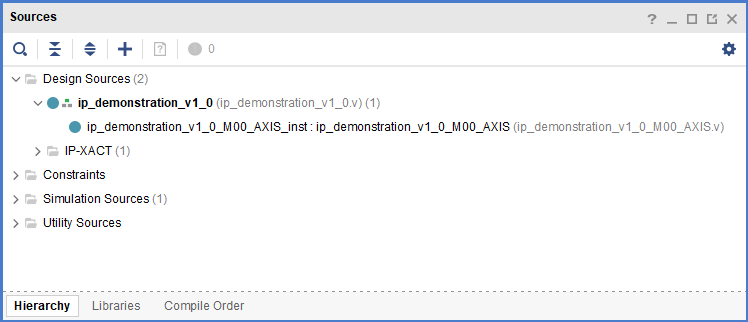 创建好后,sources列表如下,ip_demonstration_v1_0可以视为例化文件,ip_demonstration_v1_0_M00_AXIS是源文件,主要工作都在该文件中。我们打开ip_demonstration_v1_0_M00_AXIS源文件。