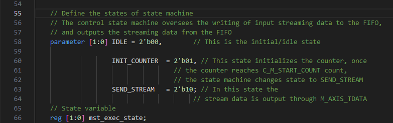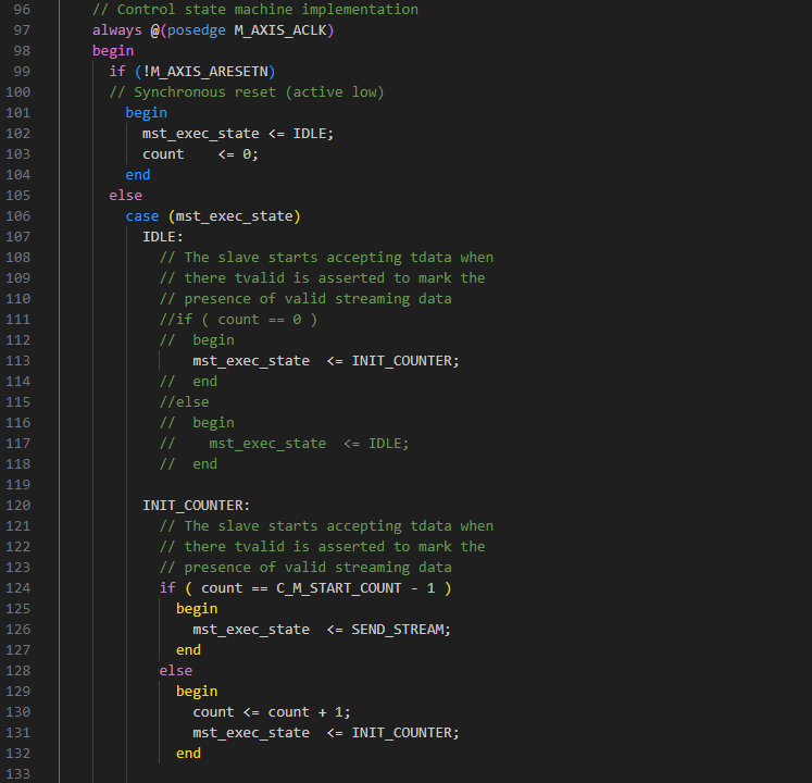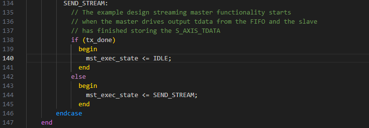 然后看状态机部分,与deepseek所说的一致,IDLE阶段直接到INIT_COUNTER阶段,在等到“count == C_M_START_COUNT - 1”条件达成后跳到SEND_STREAM状态开始传输数据,等到“tx_done为1”时结束传递并回到IDLE状态