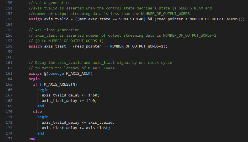 design中比较混蛋的是M_AXIS_TVALID虽然是axis_tvalid延迟了一拍得到的信号,然而“axis_tvalid = ((mst_exec_state == SEND_STREAM) && (read_pointer < NUMBER_OF_OUTPUT_WORDS))”这行代码表明了axis_tvalid 在进入NUMBER_OF_OUTPUT_WORDS状态之后基本就等于1了,这导致的结果就在于外部输入的M_AXIS_TREADY必须要先于M_AXIS_TVALID准备好,即从机要先于主机准备好。不然传输就会出错。