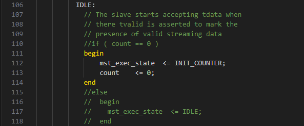 这里有一个地方可试着更改,也可不改,就是在IDLE阶段重新置0 count,因为原先的example design只是传输一次数据,无法多次传输,所以这里没有再IDLE阶段重新置0 count,当然这里不改也是可以的,结果就是第二次传输的时候从IDLE阶段到INIT_COUNTER阶段再到SEND_STREAM状态只用了两个周期,让INIT_COUNTER阶段无用了