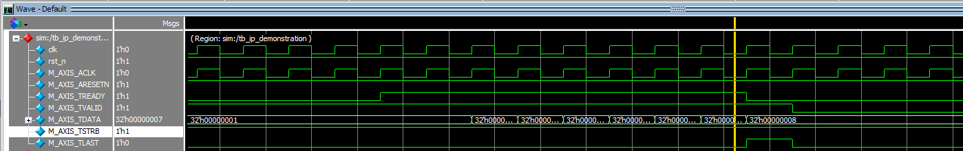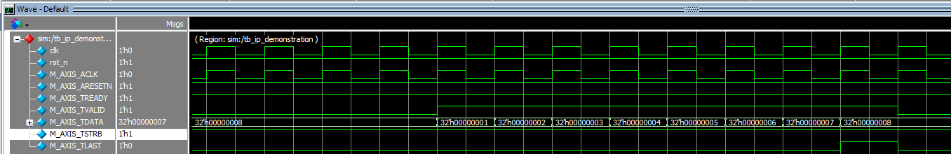 这里贴出测试代码和modelsim仿真图,众所周知,AXI4协议里,只有valid和ready同时为1的时候,数据才有效,仿真图里对应了这两个错误发生的情况,分别是数据传输错误(1、2、3、4、5、6、7、8变成了1、1、2、3、4、5、6、7)和包传输错误(talst为1的时候没采到)