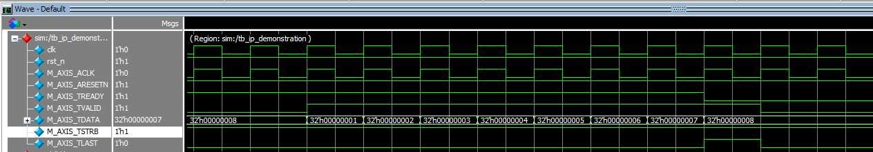 第三个是总共传输的数据个数,这里默认是8,意味着传输了8个数据之后,状态机会从SEND_STREAM状态结束,回到IDLE状态,并在一个时钟之后到达INIT_COUNTER阶段