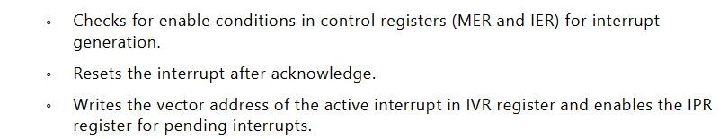 对于快速中断模式:适用于需要低延迟的设计,通过设置 IMR 寄存器启用。中断向量地址:从 IVAR 或 IVEAR 寄存器获取,通过 interrupt_address 端口发送给处理器,直接跳转到 ISR。中断确认:处理器通过 processor_ack 端口确认中断,清除 IRQ 信号并更新 IAR 寄存器。
