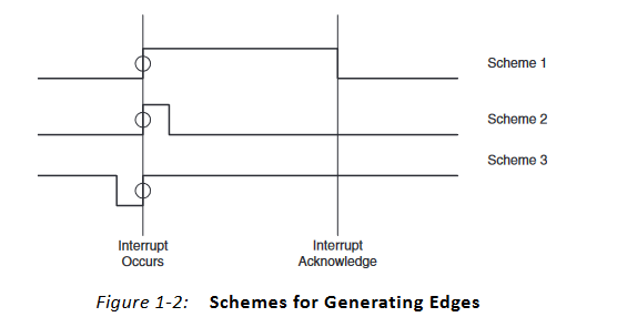 而在输入检测方面,有以下特点,第一是对于某一外部中断输入,无论是边沿检测还是电平检测,无论是否使能,当有中断条件时,都会被记录直到被清除,二是对于不同检测情况,有以下区分: 异步中断检测通过时钟同步后采样中断输入信号,确保信号的稳定性。边沿敏感中断检测需要信号在一个时钟周期内从无效变为有效,才能被检测到。电平敏感中断检测需要信号至少在一个时钟周期内保持有效电平,才能被检测到。手册里给了一个边沿触发的示意图如下。