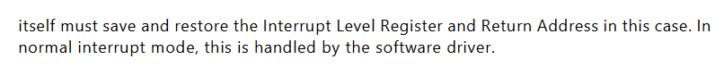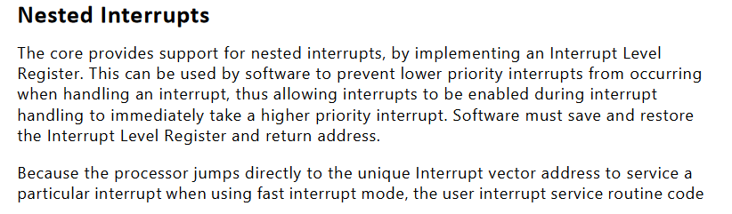 AXI INTC 核心通过实现中断级别寄存器(Interrupt Level Register)来支持嵌套中断。软件可以利用该寄存器在处理中断时阻止低优先级中断的发生,从而允许在处理中断期间启用中断以立即响应更高优先级的中断。软件必须保存和恢复中断级别寄存器和返回地址。在使用快速中断模式时,处理器会直接跳转到唯一的中断向量地址以服务特定中断。因此,用户的中断服务程序(ISR)代码必须自行保存和恢复中断级别寄存器和返回地址。在普通中断模式下,这些操作由软件驱动程序处理。