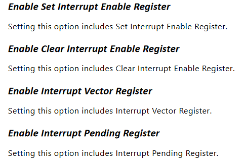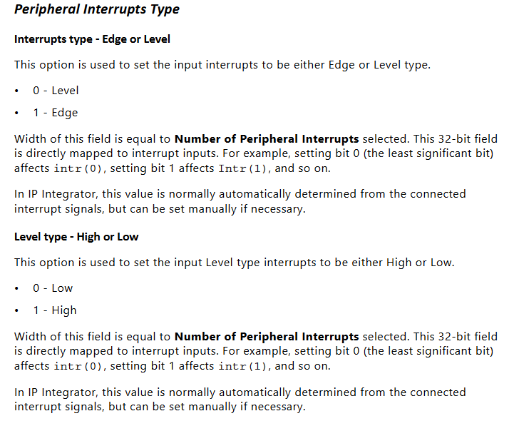 IP核内部架构如下,Registers Block就是通过AXI4-Lite协议访问的寄存器,Interrupt Detection用于检测连接的外部输入中断,至于Interrupt Generation,一、中断生成:中断控制器核心生成最终的中断输出信号,触发方式由配置参数决定。二、使能条件检查:通过 MER 和 IER 寄存器控制中断的全局和局部使能。三、中断复位:在中断被确认后,复位中断状态以允许后续中断。四、向量地址写入:将活动中断的向量地址写入 IVR 寄存器,并启用 IPR 寄存器记录挂起中断。