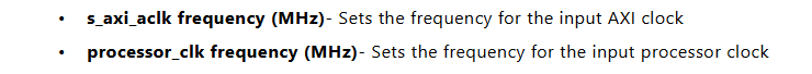 最后是clocks界面,一个是axi4协议时钟,一个是处理器时钟,看个人情况,一般上述的大多数都会自动调整,如无特别需求,如嵌套、级联、软触发、异步,基本就可以默认设置进行使用。