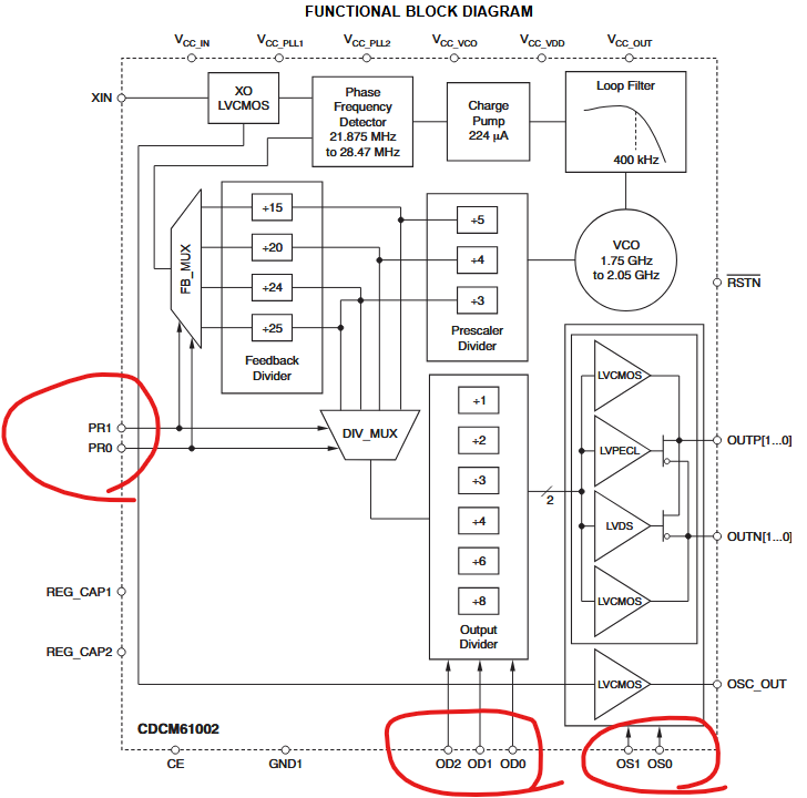 OD210为001,PR10组合为11,对应OUTPUT DIVIDER为2,PRESCALER DIVIDER为4,FEEDBACKDIVIDER为20,对应输出频率如下,为250MHz,这边蟹老板OD0接了一个FPGA信号,想用FPGA来控制采样率,因为AD9434是给多少的时钟信号,就是多少的采样率,最高500MHz,OD210为001是250MHz,改成OD210为000,理论上是500MHz,但手册里没有这个组合,可能需要实测一下。。