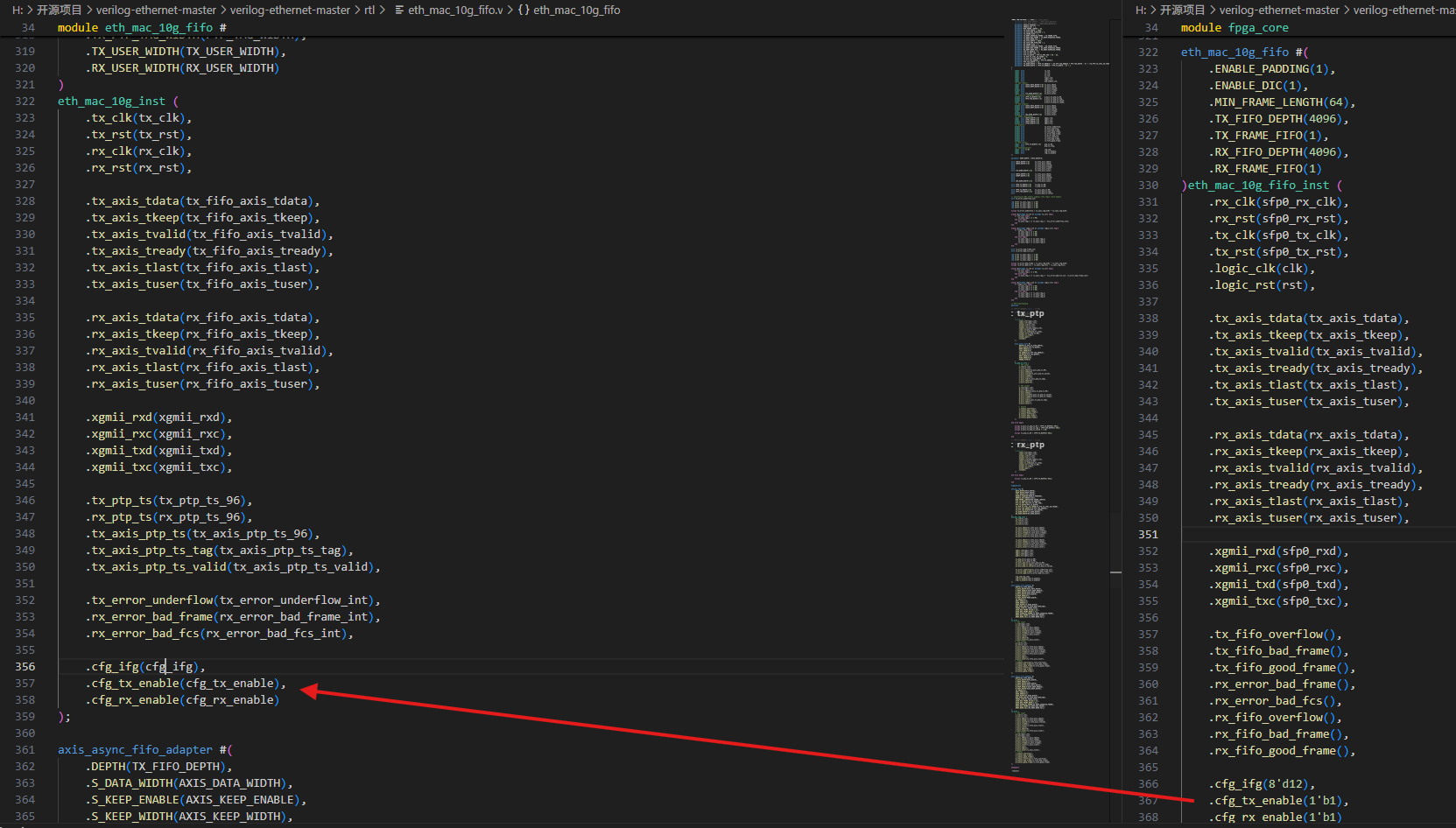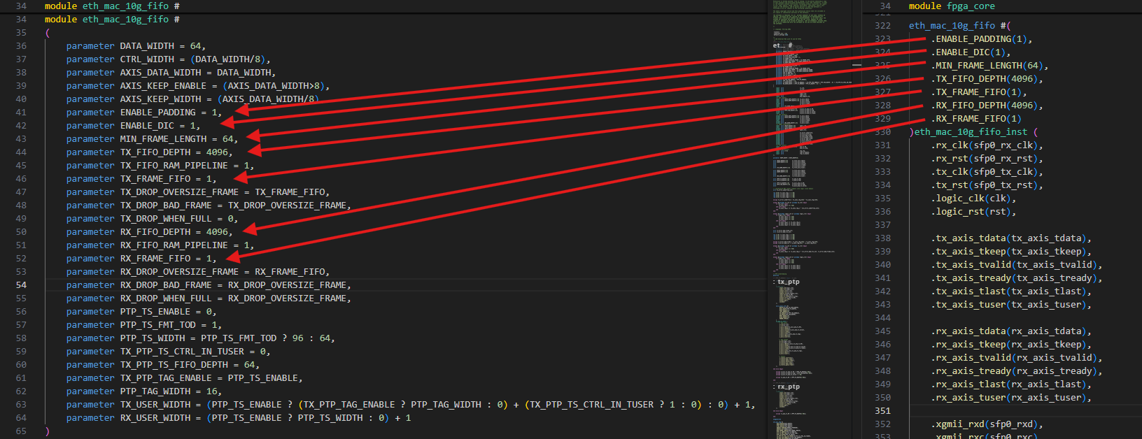 这里给出了上层fpga_core模块里eth_mac_10g_fifo的例化和eth_mac_10g_fifo的实际情况,具体例化的参数用箭头标出。