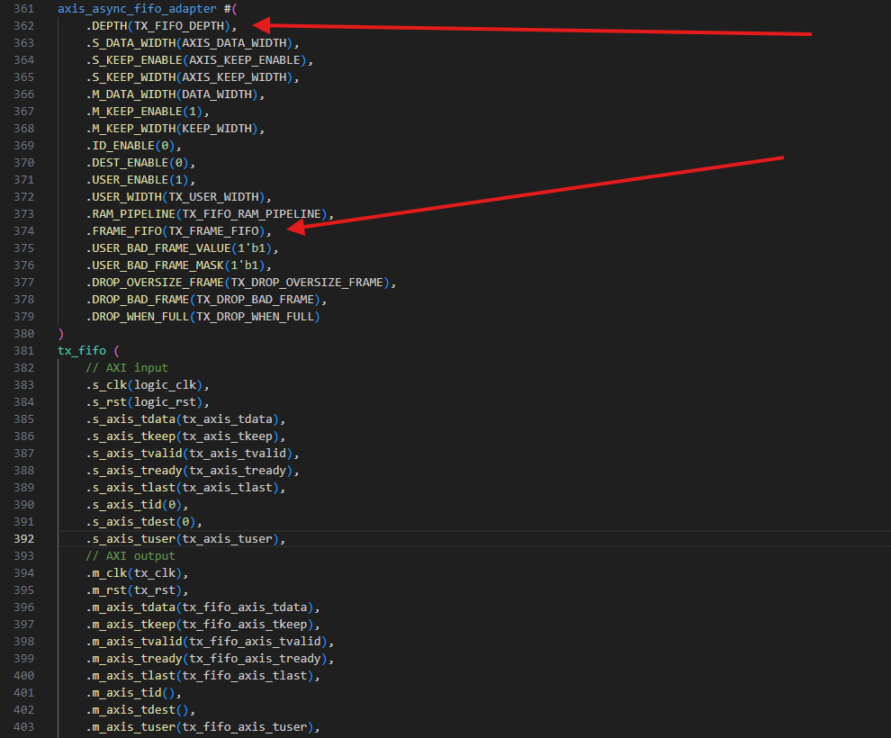 parameter TX_FIFO_DEPTH = 4096, parameter TX_FRAME_FIFO = 1, parameter RX_FIFO_DEPTH = 4096,parameter RX_FRAME_FIFO = 1,则是关联到了axis_async_fifo_adapter的参数例化,axis_async_fifo_adapter是异步fifo,用于时钟域切换。