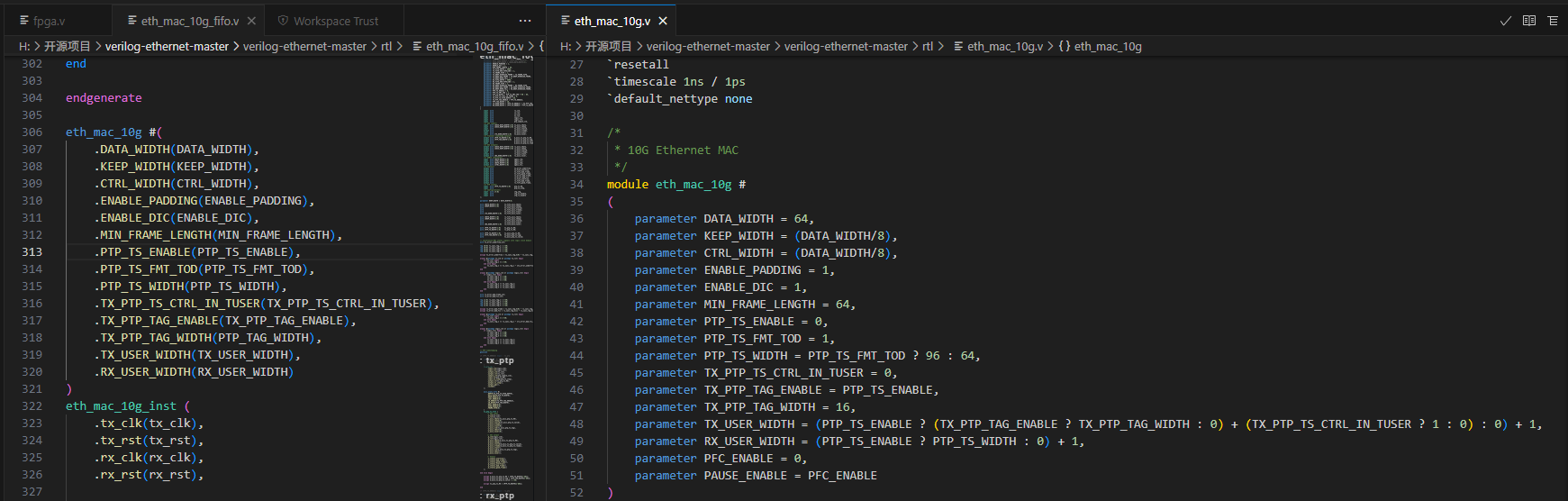 parameter ENABLE_PADDING = 1, parameter ENABLE_DIC = 1, parameter MIN_FRAME_LENGTH = 64,这三个参数关联到了里面的eth_mac_10g模块,后续再分析。