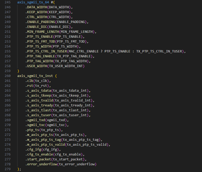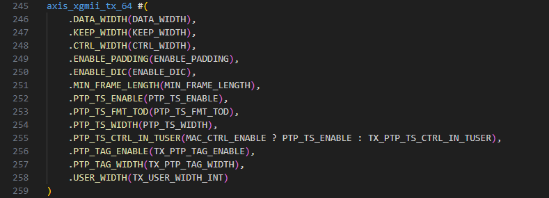 eth_mac_10g的例化比较简单。parameter ENABLE_PADDING = 1, parameter ENABLE_DIC = 1, parameter MIN_FRAME_LENGTH = 64,这三个参数关联到了axis_xgmii_tx_64模块,后续分析。PTP不启用,故其他参数不需要注意。