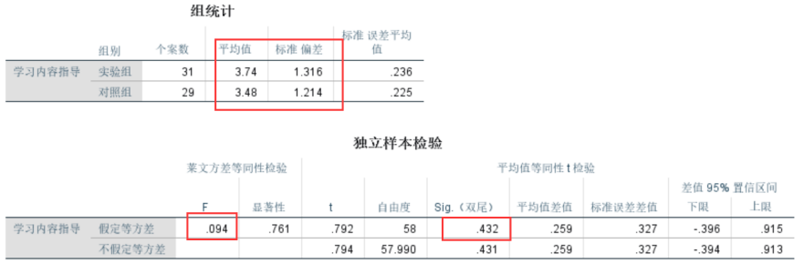两组学生的“学习内容指导”评分差异无统计学意义( t=0.79,p =0.43> 0.05)。另一方面,对于“任务挑战”,t检验结果显示,实验组的“任务挑战”显著高于对照组(t = 3.58, p < 0.05)。