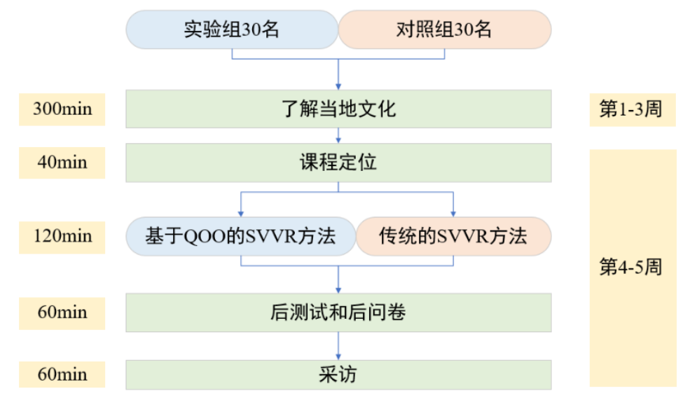 研究对象:为了考察基于QOO的SVVR方法的效果,本研究在一门文化课中对两个班共60名高中生进行了准实验。实验组学生采用基于QOO的SVVR方法学习世界文化知识,对照组学生采用传统的SVVR方法,在SVVR环境中进行观察学习。然后进行小组讨论并完成工作表。