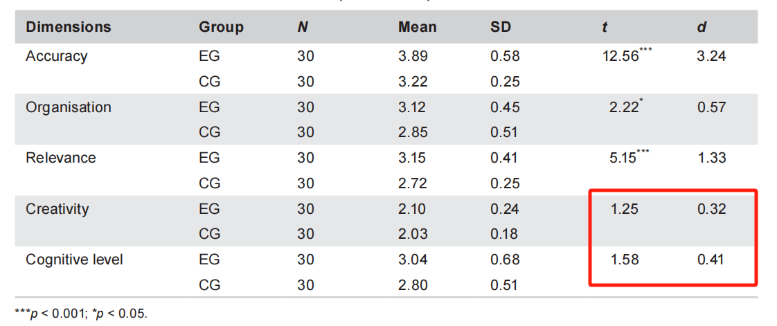 两组学生“创造力”和“认知水平”得分较低的原因:“创造力”是指学生呈现的内容新颖,并辅以一些多媒体。“认知水平”是指学生能够用自己的语言定义或描述所学内容,将不同的话题结合起来,并进行解释。分析结果在这两个维度上,不同方法之间没有显著差异。两组学生在“创造力”这一项得分最低,因为他们很少使用多媒体作为补充。在“认知水平”维度上,学生倾向于逐字逐句地呈现在线信息,而没有自己的解释方式。根据访谈结果,其中一名同学提到活动时间不够。因此,从学生的“创造力”和“认知水平”表现来看,两组学生都缺乏足够的时间进行多元思考和详细阐述。