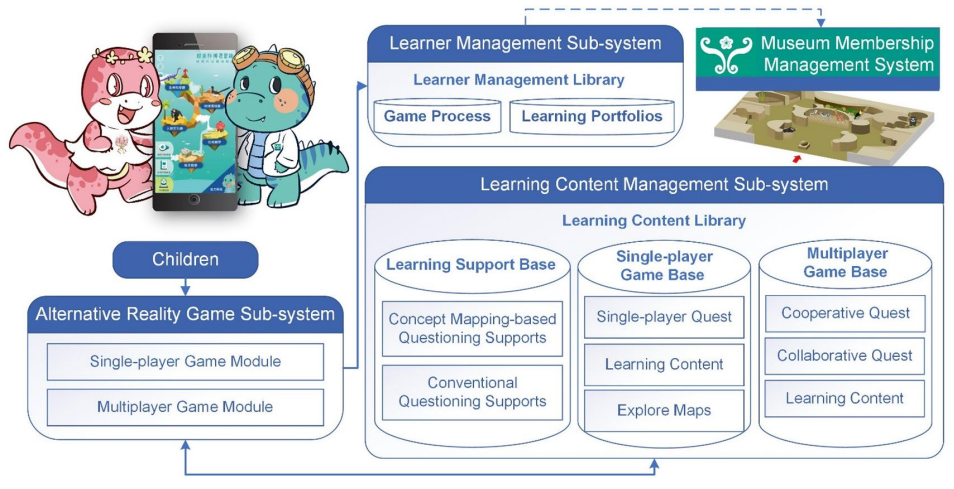 如图1所示,一个名为CoboFun的移动系统被设计用来支持儿童在现实环境中进行基于探究的学习。该系统包括ARG子系统、学习内容管理子系统(LCMS)和学习者管理子系统(LMS)。