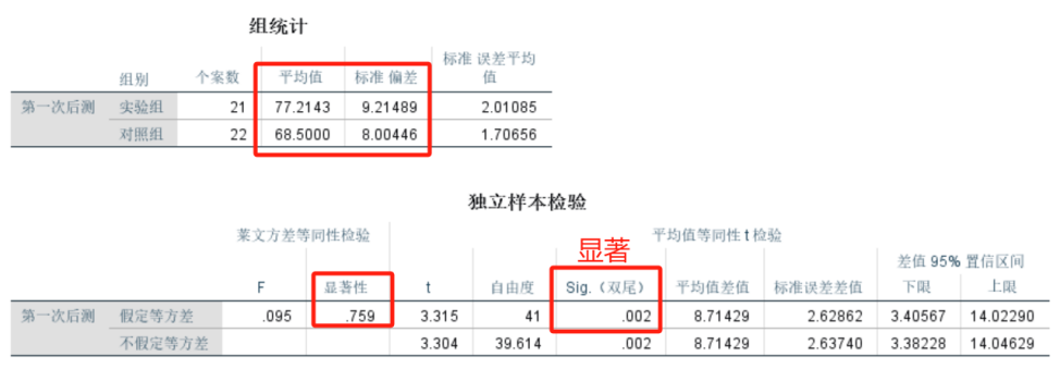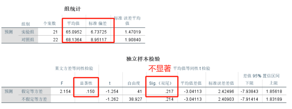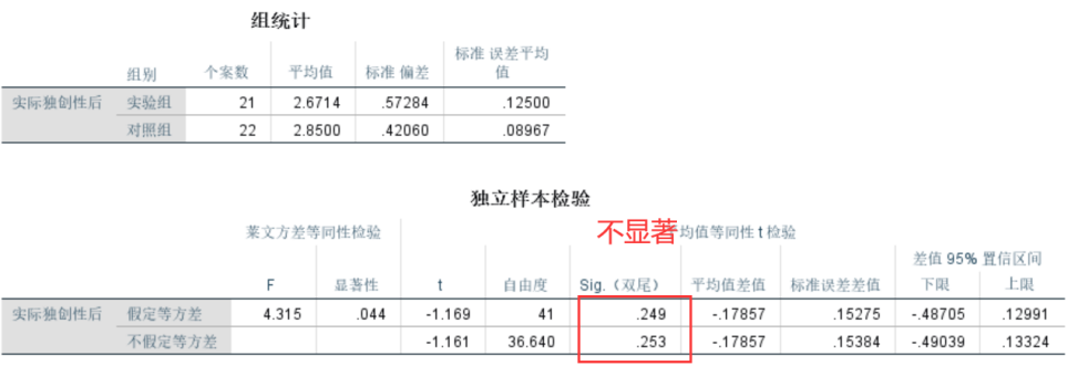 采用独立样本t检验,结果显示两组之间没有显著差异。