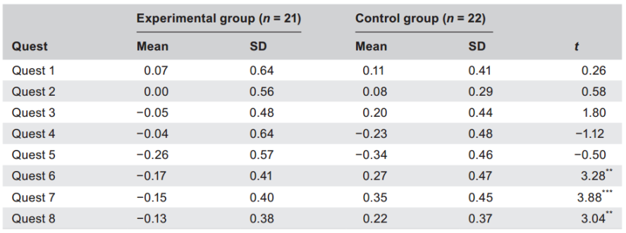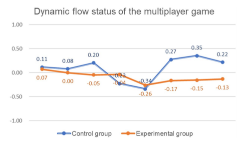 图3显示了两组多人游戏的流畅体验。与对照组相比,实验组有负流体验。结果表明,采用ARG-CMQ方法的多人游戏可能会导致儿童认知过载。表5提供了多人游戏的流量体验的独立t检验结果。注意到第六到第八个任务的显著差异(p<0.05),这表明ARG-CMQ增加了解决复杂问题的挑战。