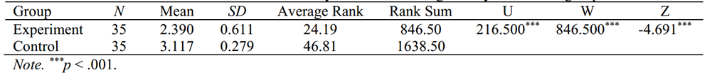 其次,采用Mann-Whitney U检验比较两组学习焦虑前测结果无显著差异。最后,再次进行Mann-Whitney U检验,比较两组的学习焦虑后测结果。结果发现,实验组的学习焦虑(M = 2.390, SD = 0.611)显著低于对照组的学习焦虑(M =3.117, SD = 0.279) (U =216.500***, p < .001),见表6。