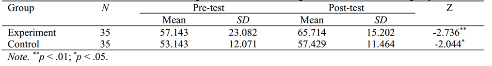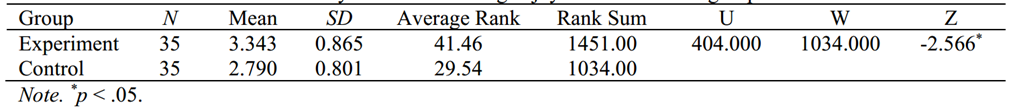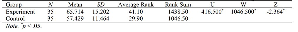 其次,采用Mann-Whitney U检验比较两组前测结果无显著差异。最后,再次进行Mann-Whitney U检验,比较两组的后测结果。结果发现,实验组的学习成绩(M = 65.714, SD = 15.202)显著优于对照组的学习成绩(M = 57.429, SD = 11.464) (U = 416.500, p < 0.05),见表4。