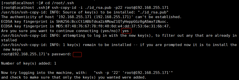 开启:[root@localhost .ssh]# ssh-copy-id -i ./id_rsa.pub -p22 root@192.168.255.171