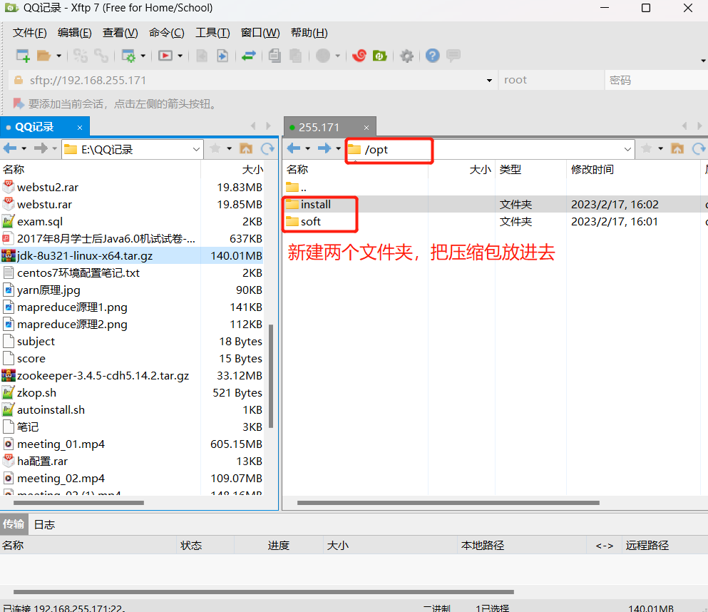 先用xftp,在/opt下新建install和soft文件夹,把压缩包放进install文件夹中