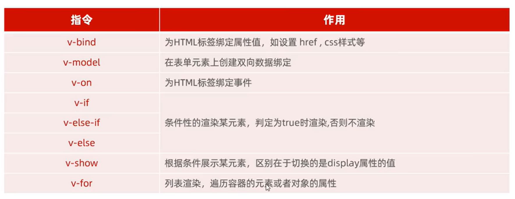 指令:HTML标签上带有v-前缀的特殊属性,不同指令具有不同含义。例如:v-if,v-for...