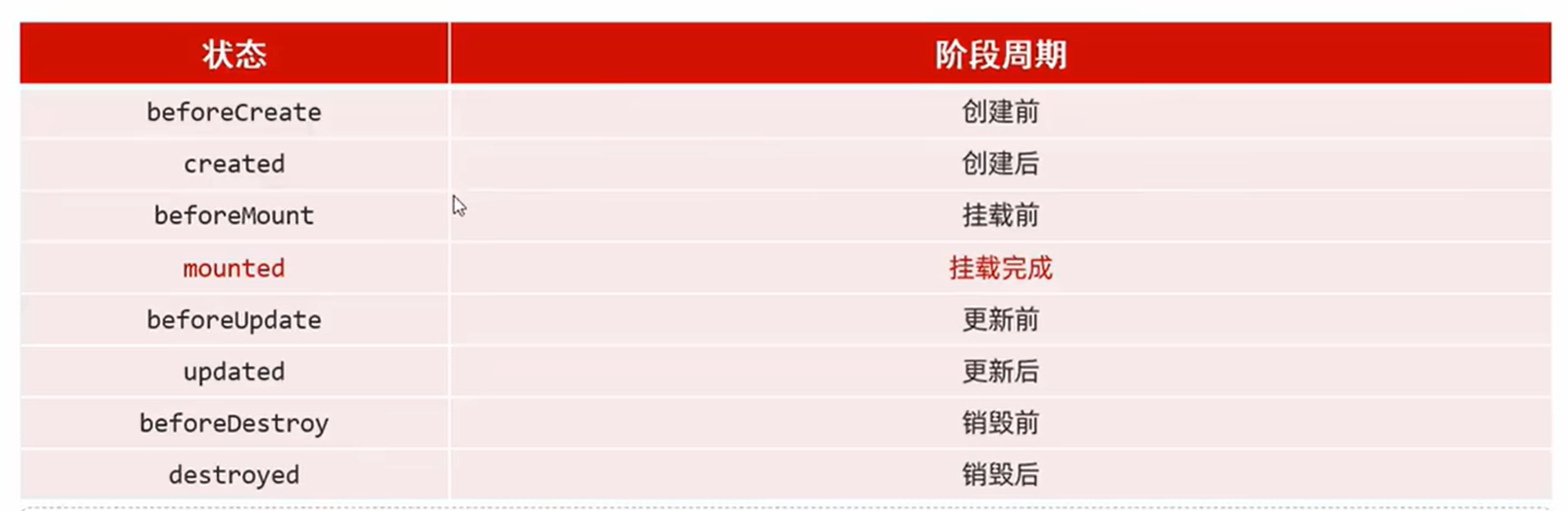 - mounted: 挂载完成,Vue初始化成功,HTML页面渲染成功。(发送请求到服务端,加载数据)