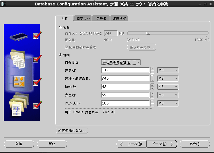 - 选择manual shared momory management(asmm),需要指定share pool、buffer cache、java pool、large pool、pga大小。(也就是说,我们要启用asmm,需要启用以上组件。)