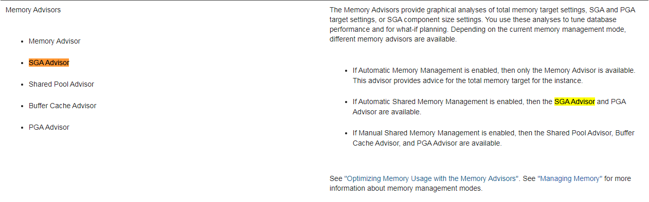- If Automatic Shared Memory Management is enabled, then the SGA Advisor and PGA Advisor are available.(如果启用了asmm,那么可以使用sga advisor、pga advisor。)