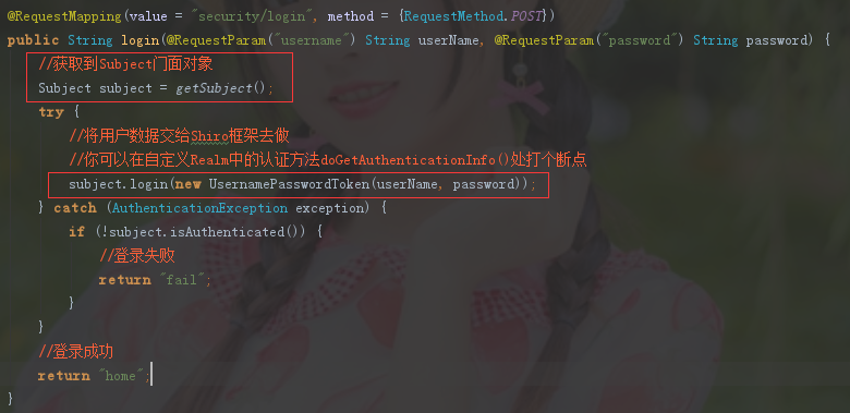 我们再找到处理此请求的Controller代码。显然,此请求将用户名密码封装成了一个Token对象,交给了Subject门面对象去做登录。
