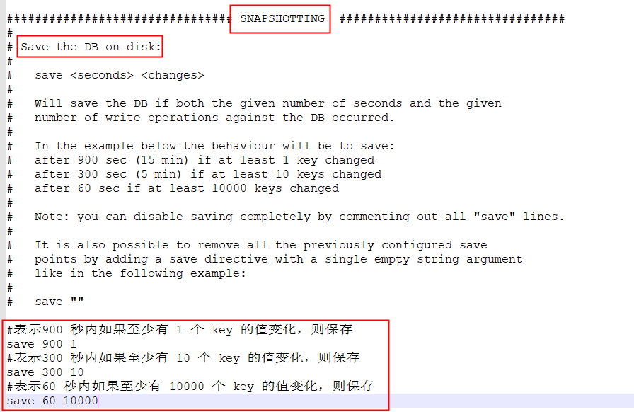 在 redis.conf 配置文件中的 SNAPSHOTTING 下,有默认如下的配置。