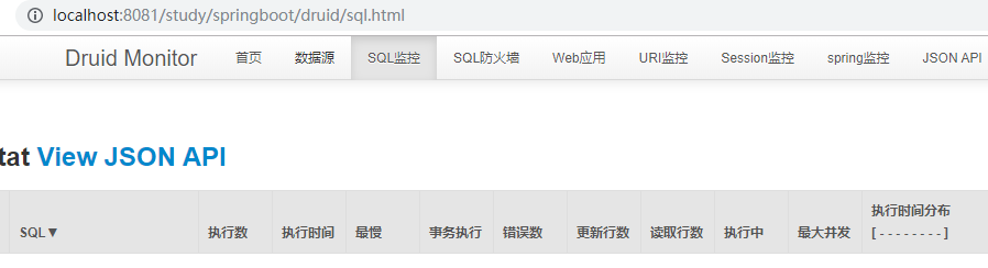 访问SQL监控页面:http://localhost:8081/study/springboot/druid/login.html。输入账号密码admin、admin。