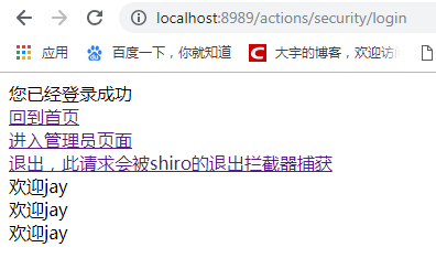 在登录页面上输入"jay / 123456",登录成功后,页面被转到home.jsp页面。效果如图所示。