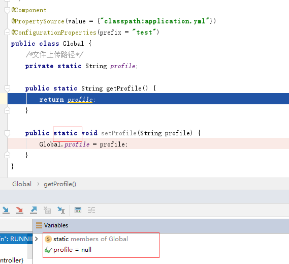 3、解决: 去掉static。 理由:@ConfigurationProperties注解属性能被设置,其中set() 方法被Public修饰并且没有被Static、Abstract修饰;