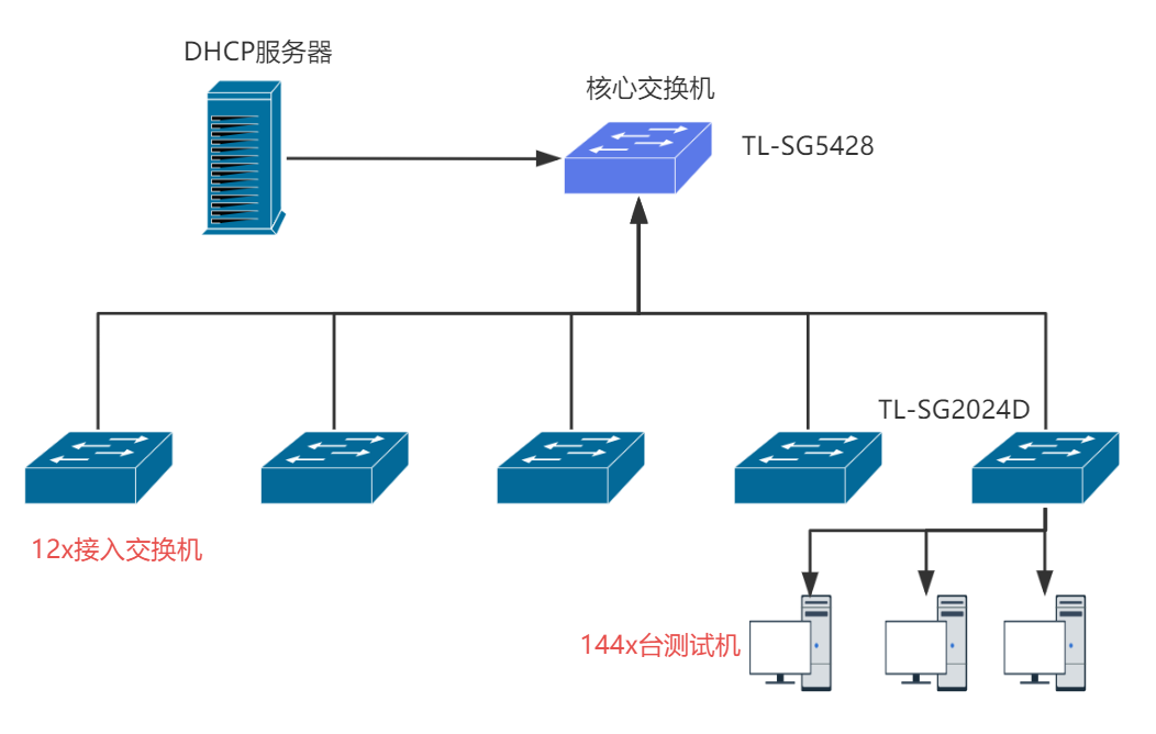 客户使用TPLINK TL-SG2024D作为接入交换机, TL-SG5428作为核心交换机, 网络拓扑如下: