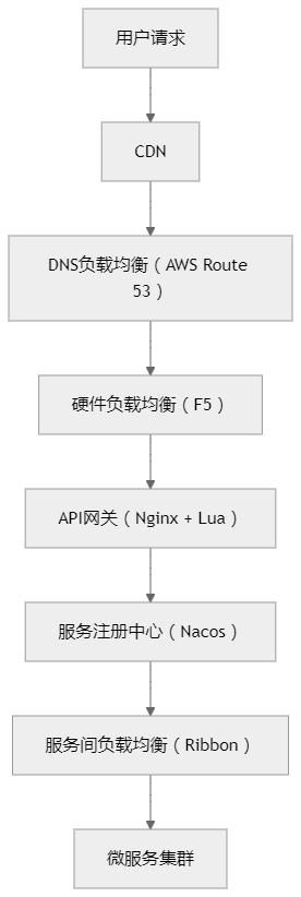 - 多级负载均衡:DNS层(Route 53)→ 硬件层(F5)→ 软件层(Nginx)→ 服务间(Ribbon)。