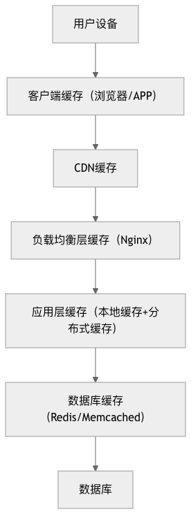 - 浏览器缓存(静态资源)→ CDN(商品图片)→ 应用本地缓存(JVM 缓存热门商品)→ Redis 集群(全量商品)。