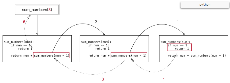 def sum_numbers(num): print(num) # 递归的出口很重要,否则会出现死循环 if num == 1: return sum_numbers(num - 1) sum_numbers(3)