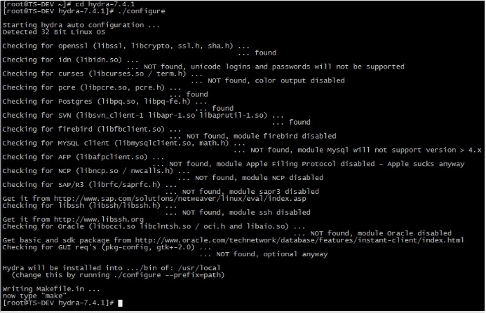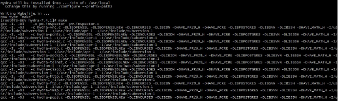 # cd /usr/local/src # wget http://freeworld.thc.org/releases/hydra-6.3-src.tar.gz # tar zxf hydra-6.3-src.tar.gz # cd hydra-6.3-src # ./configure # make # make install